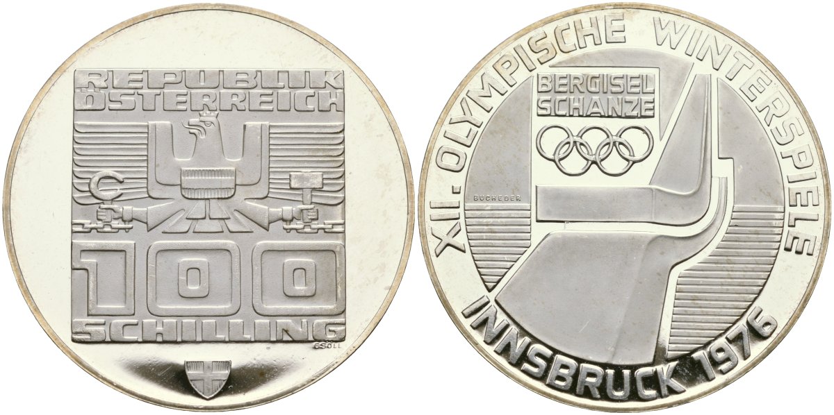 Австрия 100 шиллингов 1976 XII зимние Олимпийские игры в Инсбруке, лыжный трамплин KM 2929 серебро UNC 02-118-13