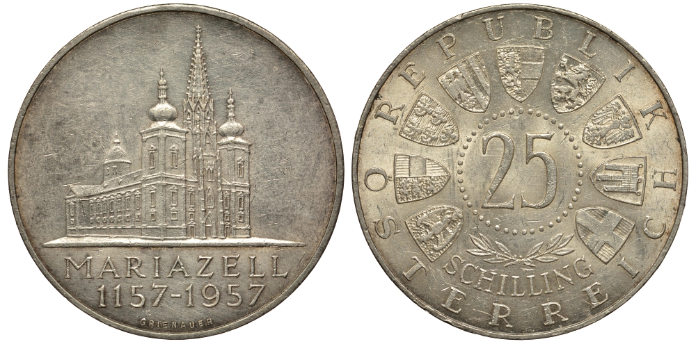 АВСТРИЯ 25 ШИЛЛИНГОВ 1957 800 ЛЕТ МАРИАЗЕЛЬ БАЗИЛИКИ KM 2883 серебро aUNC 1520-135