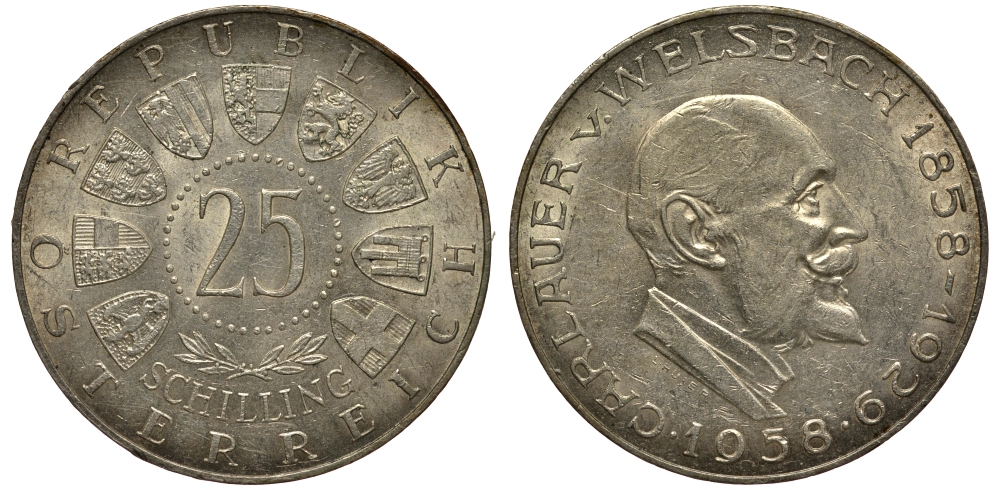 Австрия 25 шиллингов 1958 100 лет со дня рождения Карла Вельсбаха KM 2884 серебро aUNC 1520-123