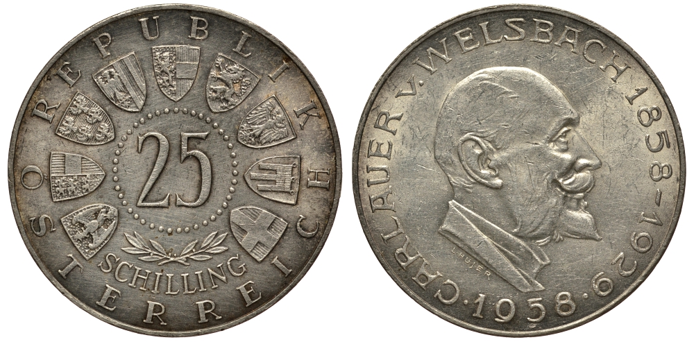 Австрия 25 шиллингов 1958 100 лет со дня рождения Карла Вельсбаха KM 2884 серебро aUNC 1520-124