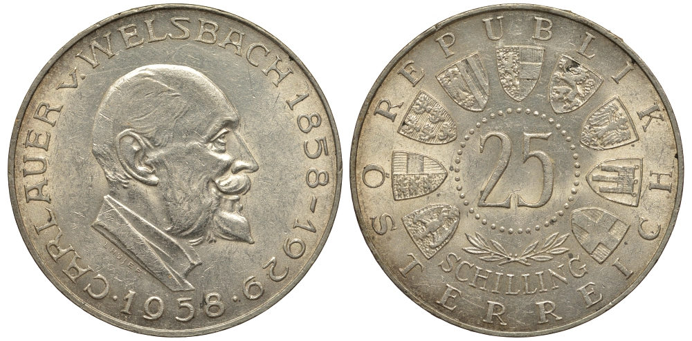Австрия 25 шиллингов 1958 100 лет со дня рождения Карла Вельсбаха KM 2884 серебро aUNC 1520-145