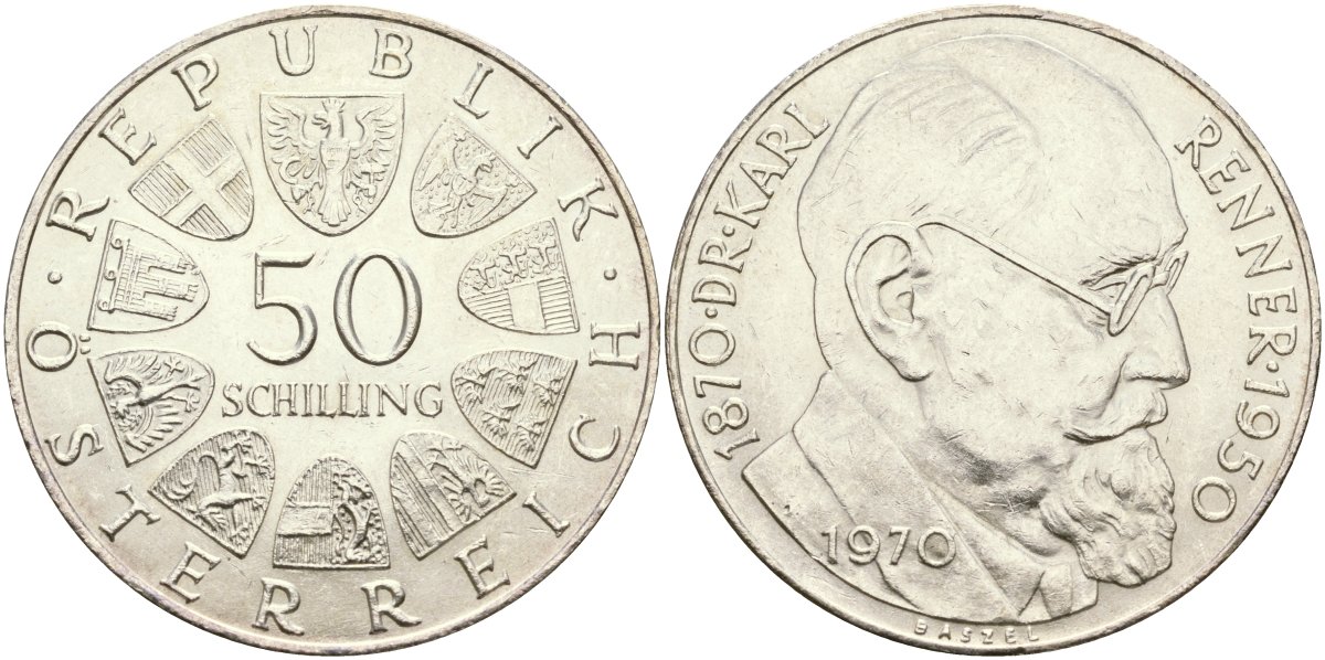 Австрия 50 шиллингов 1970 100 лет со дня рождения Карла Реннера KM 2909 серебро UNC 04-322-45