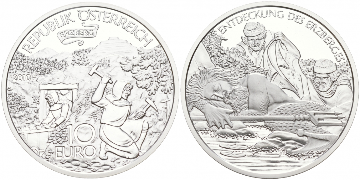 Австрия 10 евро 2010 серии сказки и легенды, открытие горы Эрцберг (железная гора) в Штирии KM 3185 серебро PROOF 00-000-00