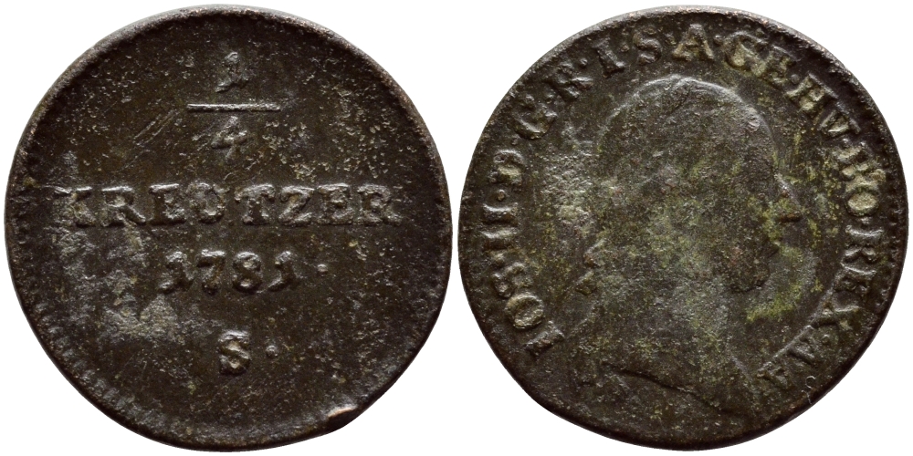 АВСТРИЯ 1/4 КРЕЙЦЕРА 1781 S, ЖОЗЕФ II (1780-1790) KM 2051 медь 1524-1045