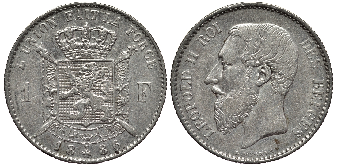 БЕЛЬГИЯ 1 ФРАНК 1886 ЛЕОПОЛЬД II (1865-1909), BELGES, РАЗНОВИДНОСТЬ БЕЗ ТОЧКИ В ПОДПИСИ KM 28.2 серебро 443-942