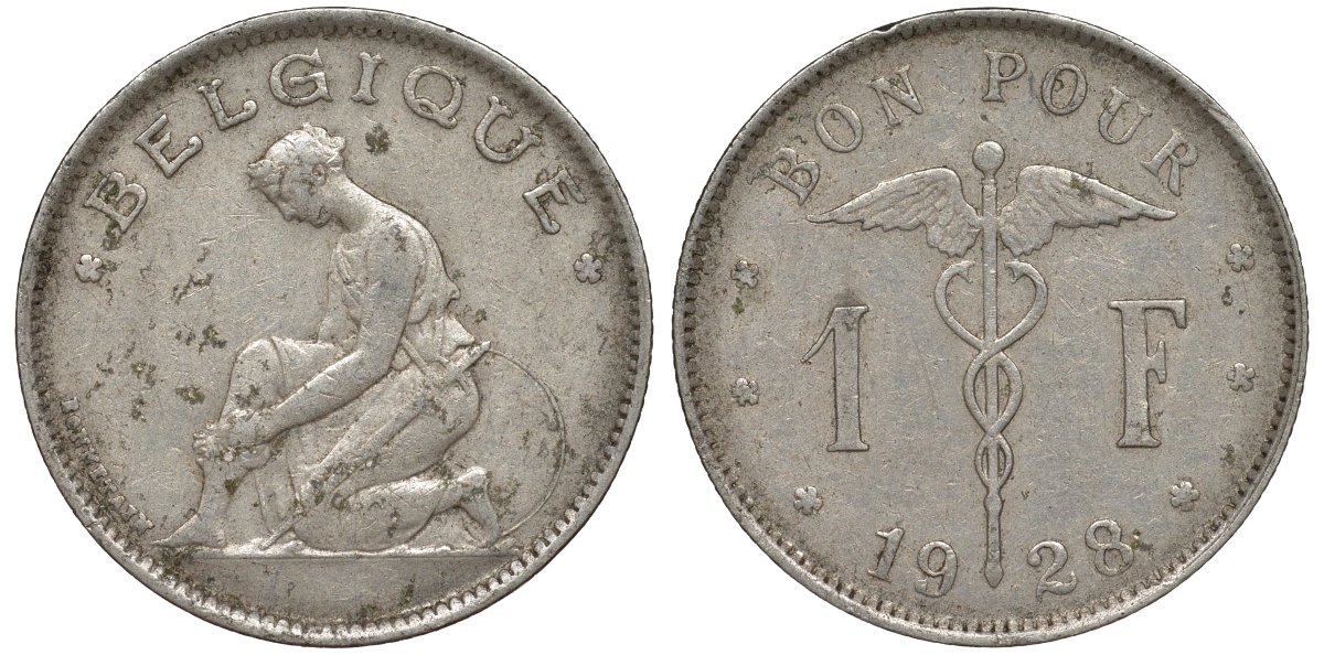 Бельгия 1 франк 1928 Belgique KM 89 никель 51-2031