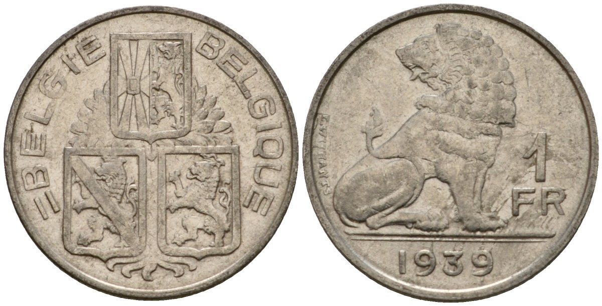 Бельгия 1 франк 1939 Belgie - Belgique KM 120 никель 217-541