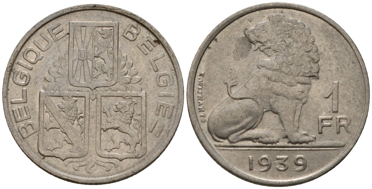 Бельгия 1 франк 1939 Belgique - Belgie KM 119 никель 4603-1225