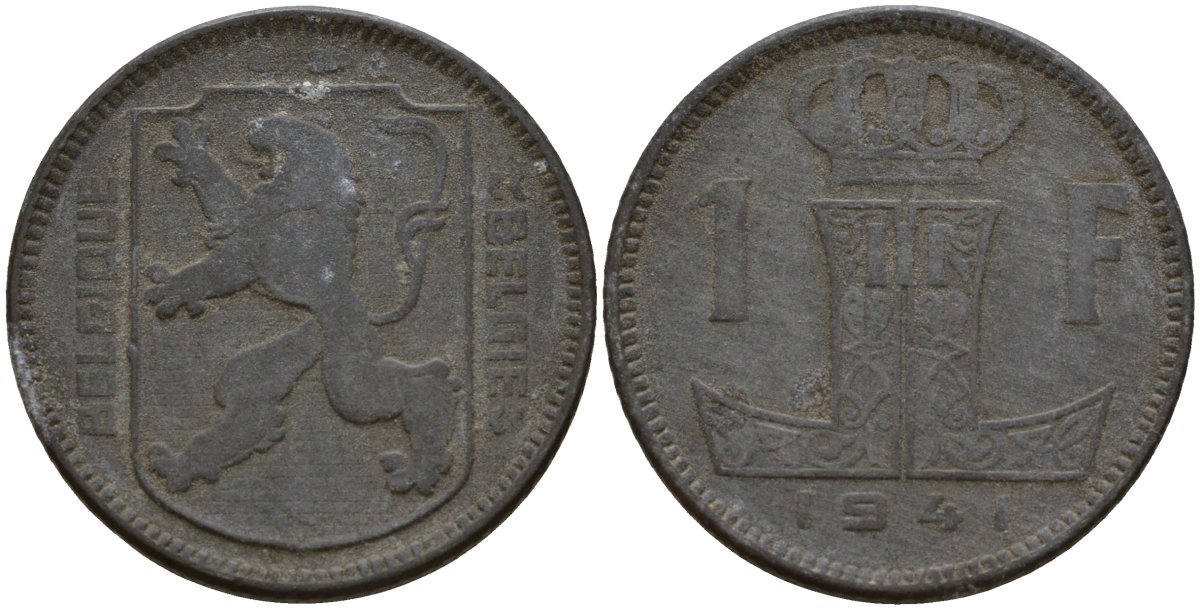 Бельгия 1 франк 1941 Belgique - Belgie, Леопольд III (1934-1947), германская оккупация, Вторая мировая война KM 127 цинк 4161-413