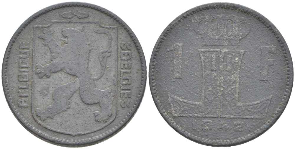 БЕЛЬГИЯ 1 ФРАНК 1942 BELGIQUE-BELGIE, ГЕРМАНСКАЯ ОККУПАЦИЯ, ВТОРАЯ МИРОВАЯ ВОЙНА KM 127 цинк 213-317
