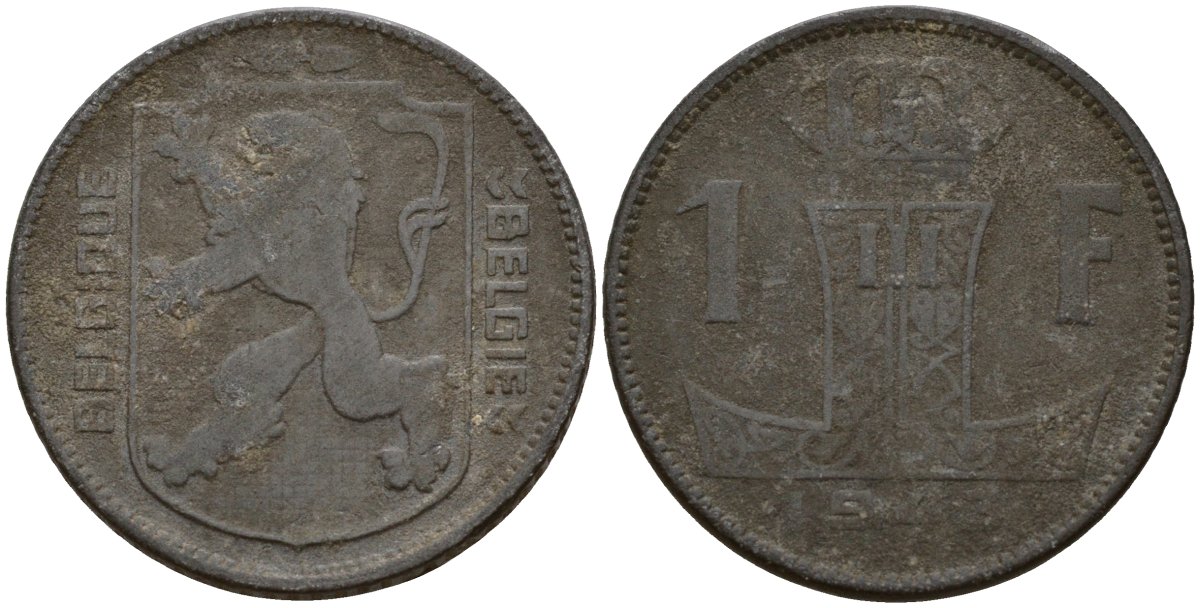 Бельгия 1 франк 1943 Belgique - Belgie, Леопольд III (1934-1947), германская оккупация, Вторая мировая война KM 127 цинк 4161-511