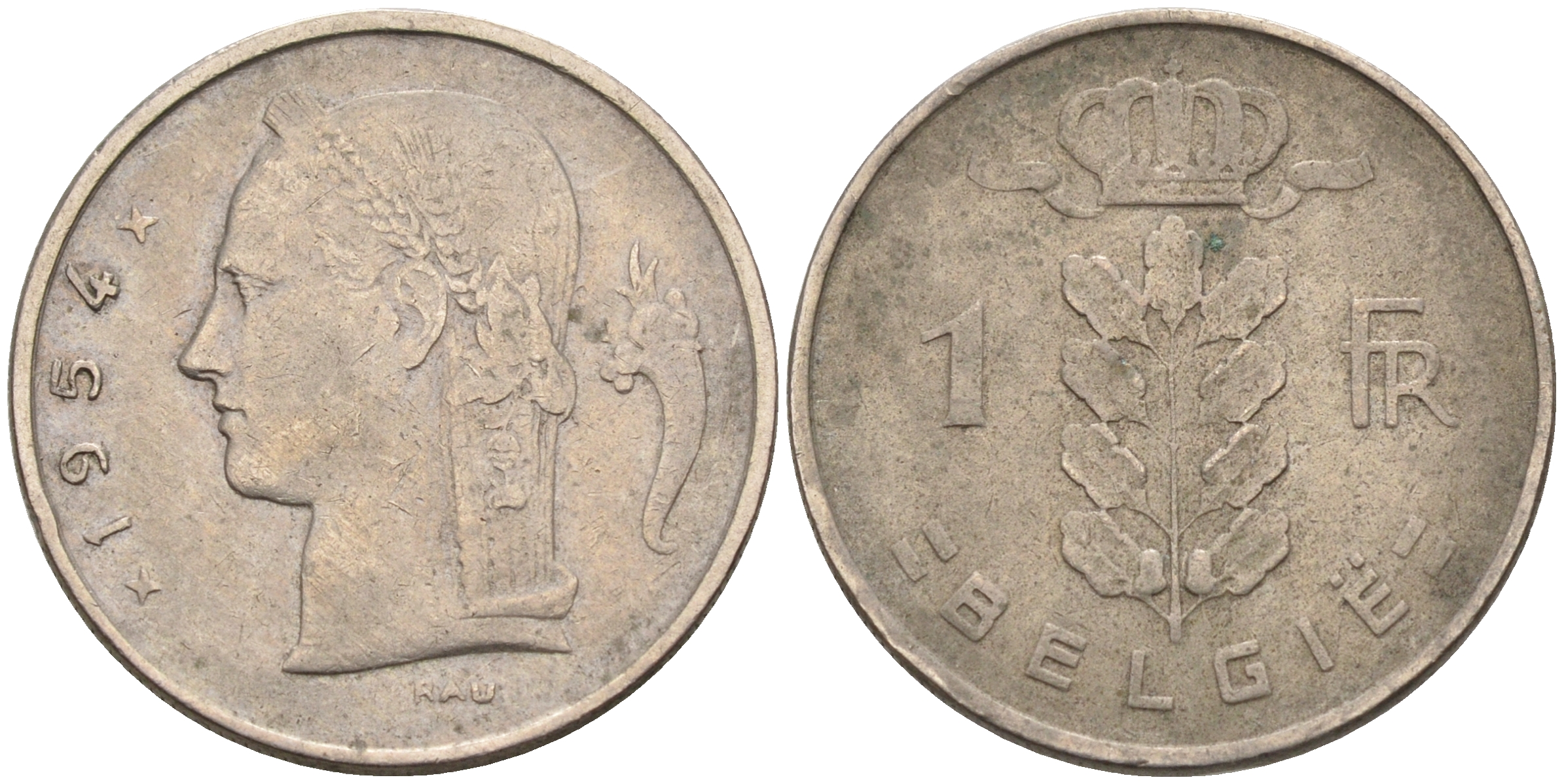 БЕЛЬГИЯ 1 ФРАНК 1954 BELGIE KM 143.1 медно-никель 4563-1214