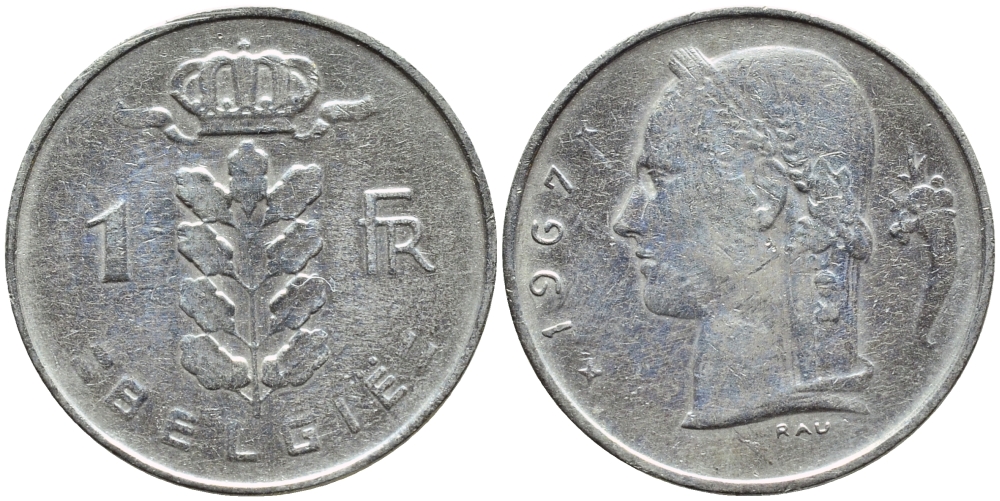 БЕЛЬГИЯ 1 ФРАНК 1967 BELGIE KM 143.1 медно-никель 4388-935