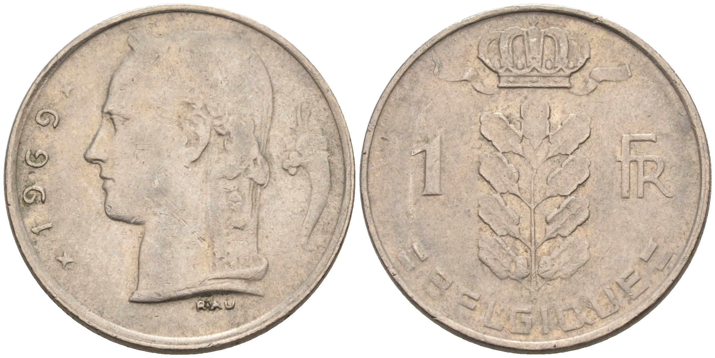 БЕЛЬГИЯ 1 ФРАНК 1969 BELGIQUE KM 142.1 медно-никель 4563-1256
