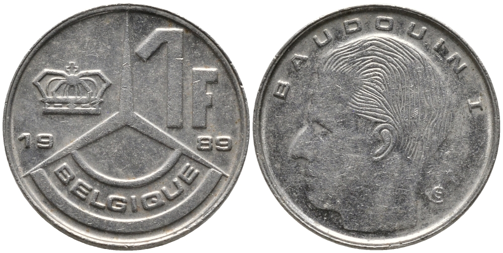 Бельгия 1 франк 1989 Belgique, Бодуэн I (1951-1993) KM 170 железо плакированное никелем 99-1221