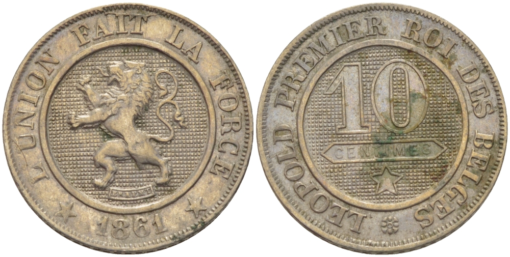 БЕЛЬГИЯ 10 САНТИМОВ 1861 BELGES KM 22 медно-никель 24-342