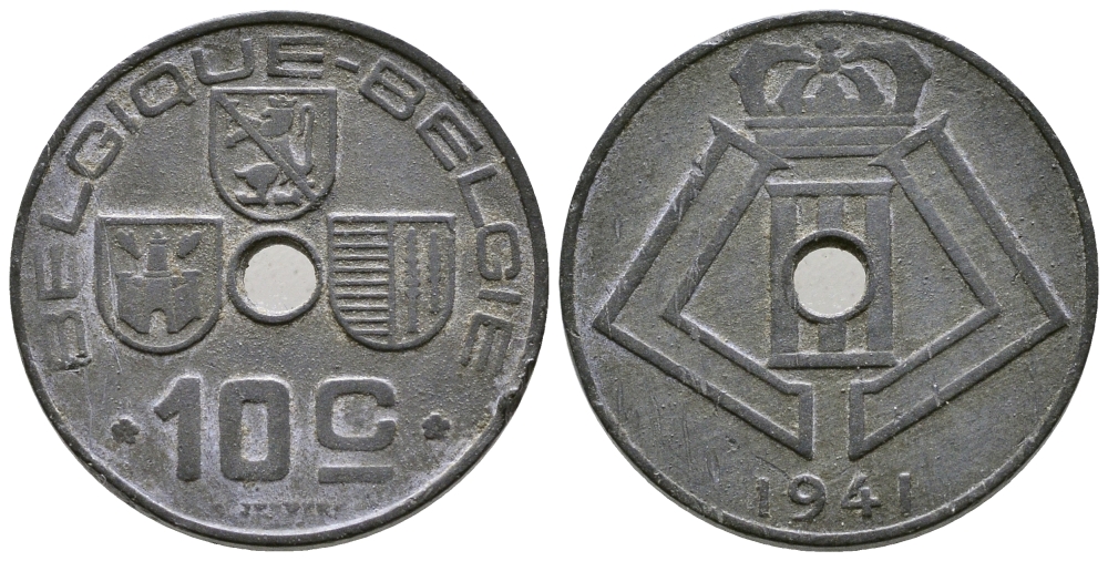 БЕЛЬГИЯ 10 САНТИМОВ 1941 BELGIQUE-BELGIE, ГЕРМАНСКАЯ ОККУПАЦИЯ, ВТОРАЯ МИРОВАЯ ВОЙНА KM 125 цинк 177-1023