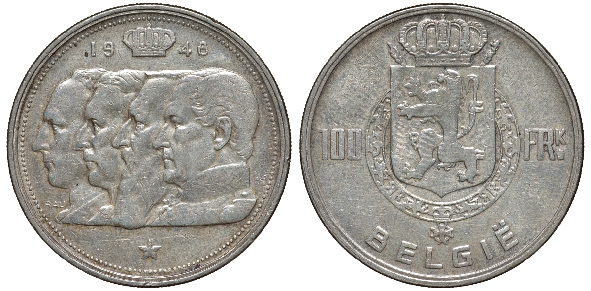 Бельгия 100 франков 1948 Belgie, королевская династия KM 139.1 серебро 1530-624