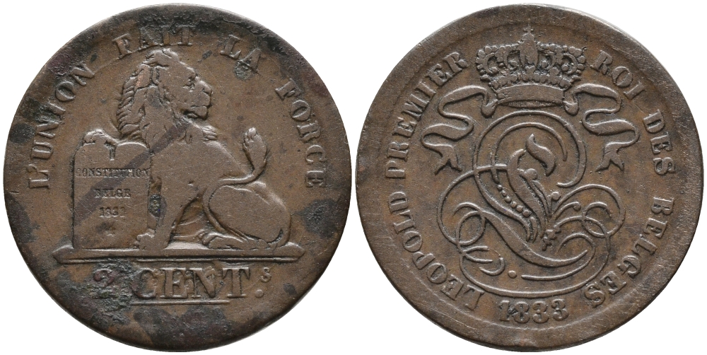 БЕЛЬГИЯ 2 САНТИМА 1833 BELGES KM 4.1 медь 95-641