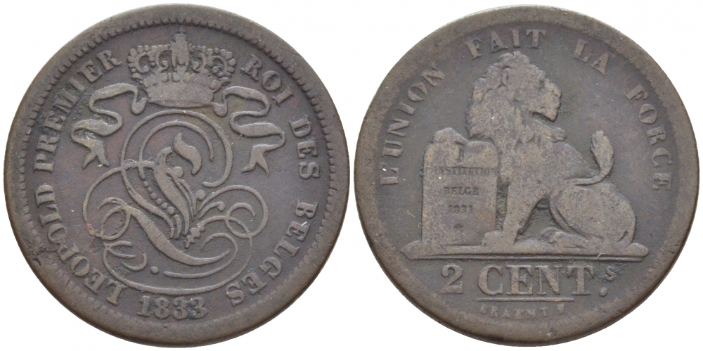 БЕЛЬГИЯ 2 САНТИМА 1833 BELGES KM 4.2 медь 4448-544