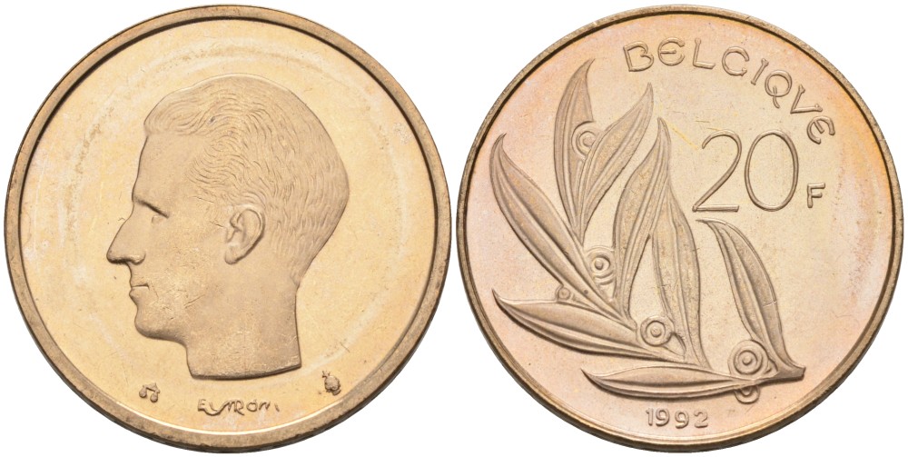 Бельгия 20 франков 1992 Belgique KM 159 никель бронза UNC 189-923