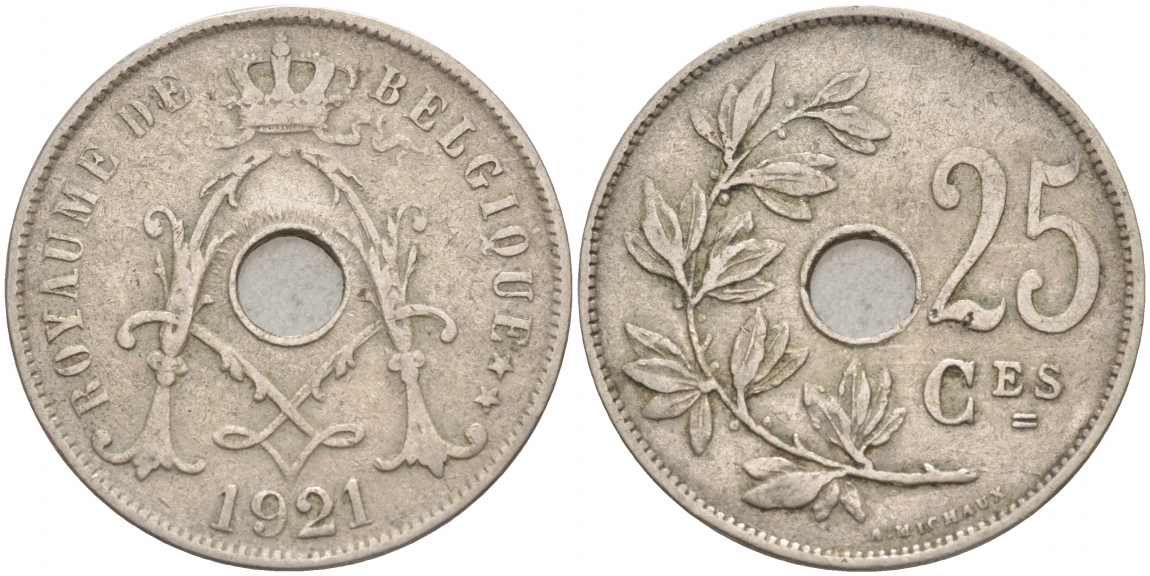 БЕЛЬГИЯ 25 САНТИМОВ 1921 BELGIQUE KM 68.1 медно-никель 68-227