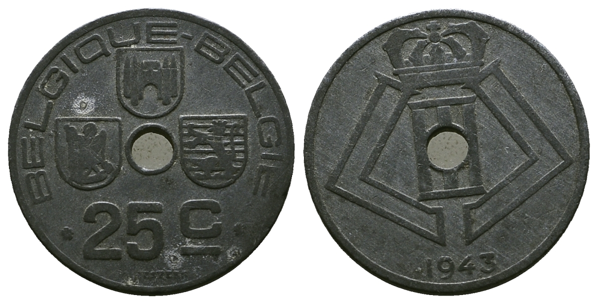 Бельгия 25 сантимов 1943 Belgique - Belgie, немецкая оккупация KM 131 цинк 259-955