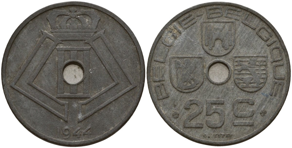Бельгия 25 сантимов 1944 Belgie - Belgique, Леопольд III (1934-1947), германская оккупация, Вторая мировая война KM 132 цинк 4157-631