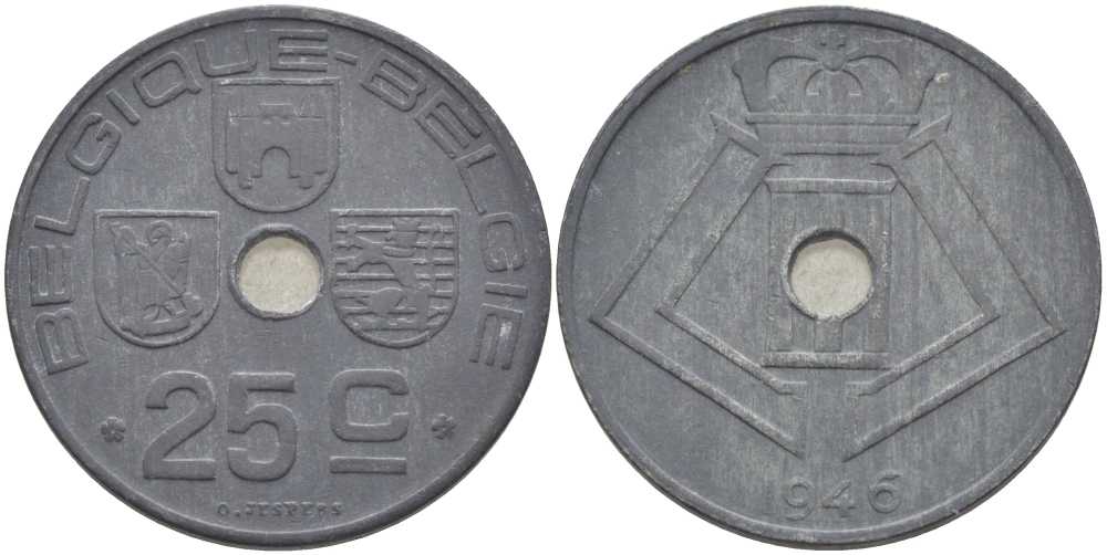БЕЛЬГИЯ 25 САНТИМОВ 1946 BELGIQUE-BELGIE, ГЕРМАНСКАЯ ОККУПАЦИЯ, ВТОРАЯ МИРОВАЯ ВОЙНА, ЛЕОПОЛЬД III (1934-1950) KM 131 цинк 119-411