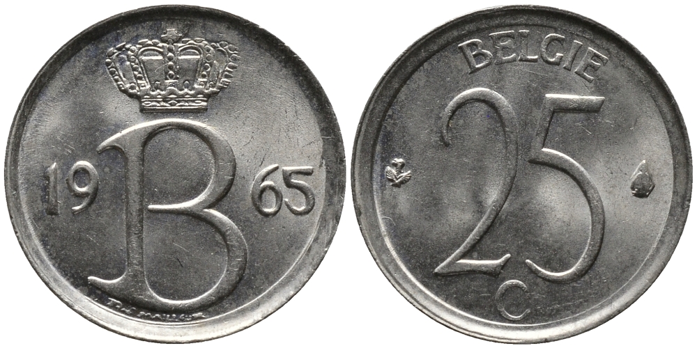 Бельгия 25 сантимов 1965 Belgie, Бодуэн I (1951-1993) KM 154.1 медно-никель 99-352