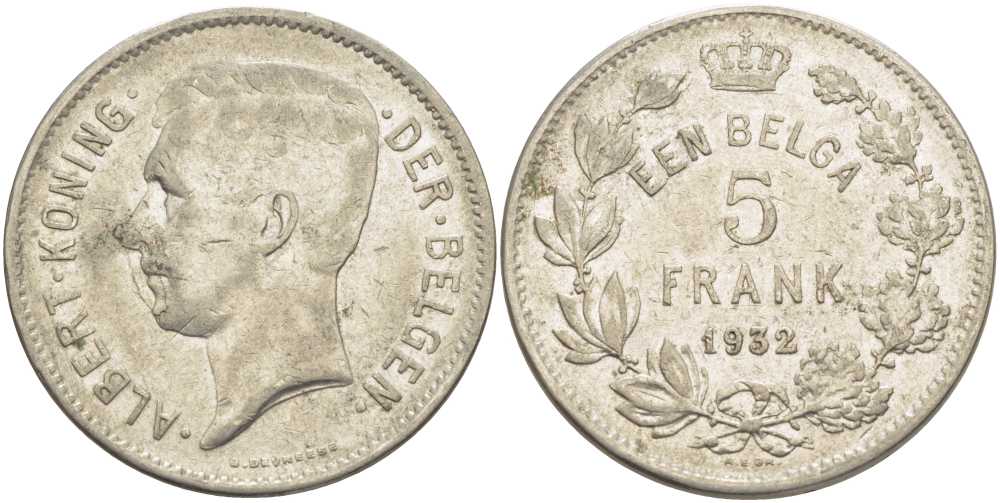 БЕЛЬГИЯ 5 ФРАНКОВ 1932 АЛЬБЕРТ I, DER BELGEN KM 98 никель 3851-432
