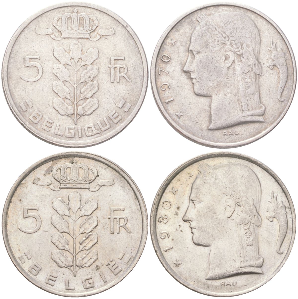 Бельгия набор из 2 монет разных типажей (5 франков) 1970 и 1980 Belgique и Belgie, Бодуэн I (1951-1993) KM 134 и 135 медно-никель 4143-513-514