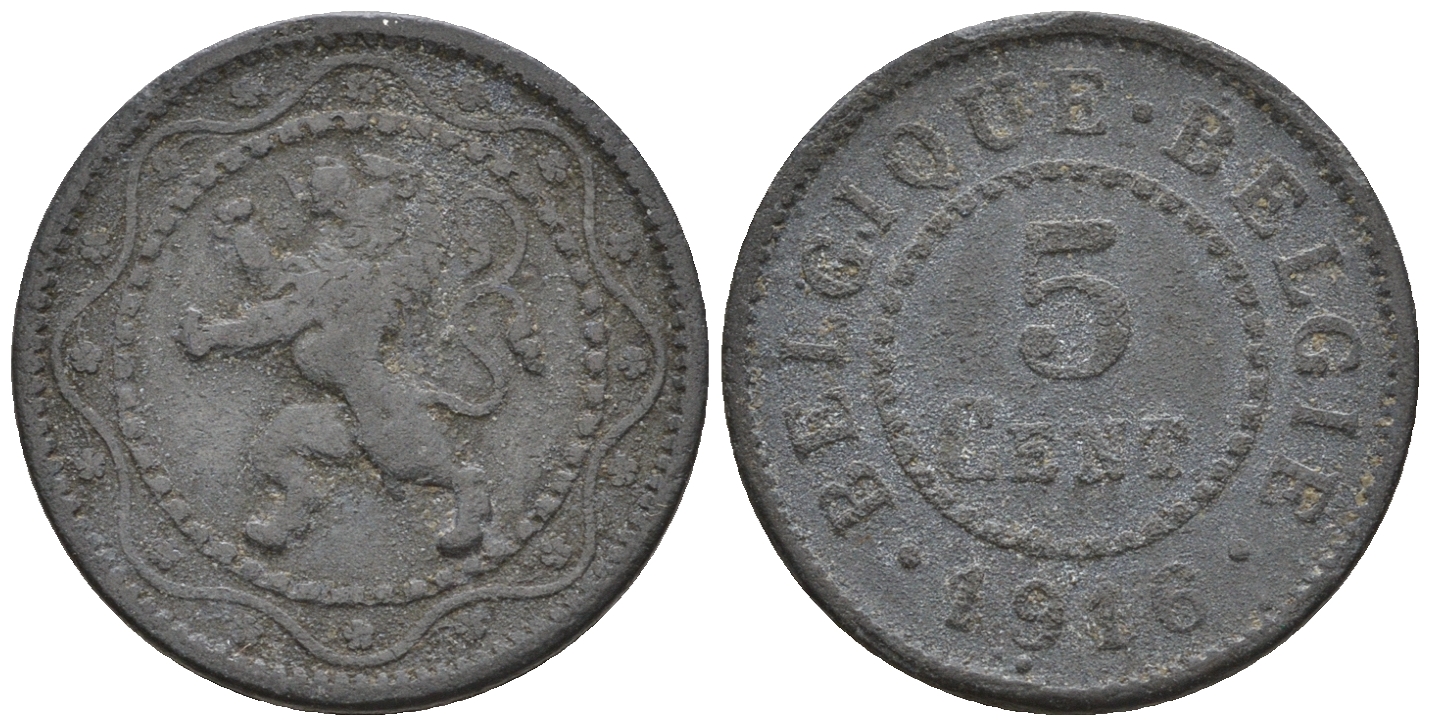 Бельгия 5 сантимов 1916 Belgique-Belgie, германская оккупация, I-ая мировая война KM 80 цинк 220-551