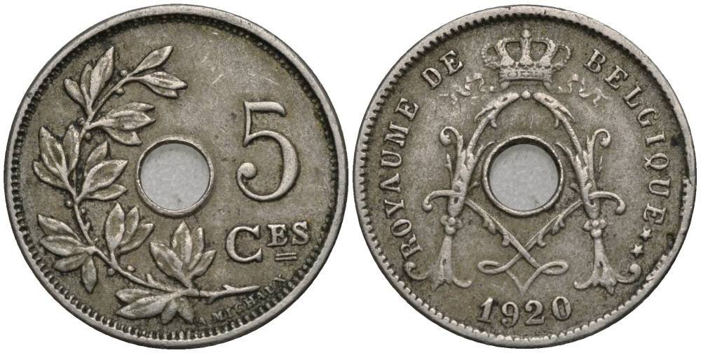 БЕЛЬГИЯ 5 САНТИМОВ 1920 BELGIQUE, АЛЬБЕРТ I (1909-1934) KM 66 медно-никель 4548-1244