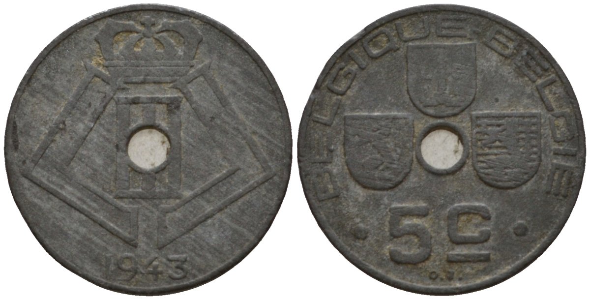 Бельгия 5 сантимов 1943 Belgique - Belgie KM 123 цинк 4548-1237