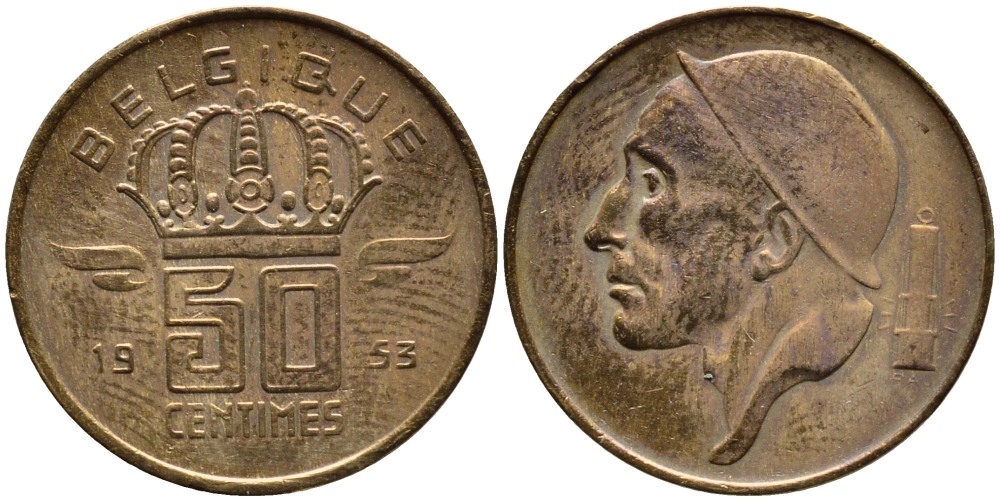 БЕЛЬГИЯ 50 САНТИМОВ 1953 BELGIQUE KM 144 бронза 4392-759
