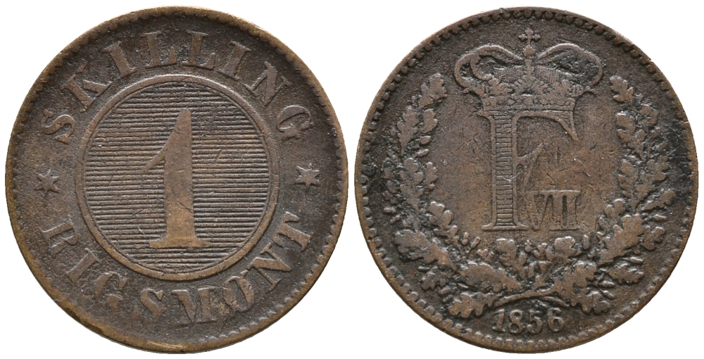 ДАНИЯ 1 СКИЛЛИНГ РИГСМОНТ 1856 ФРЕДЕРИК VII (1848-1863) KM 763 (С135) бронза 28-1134