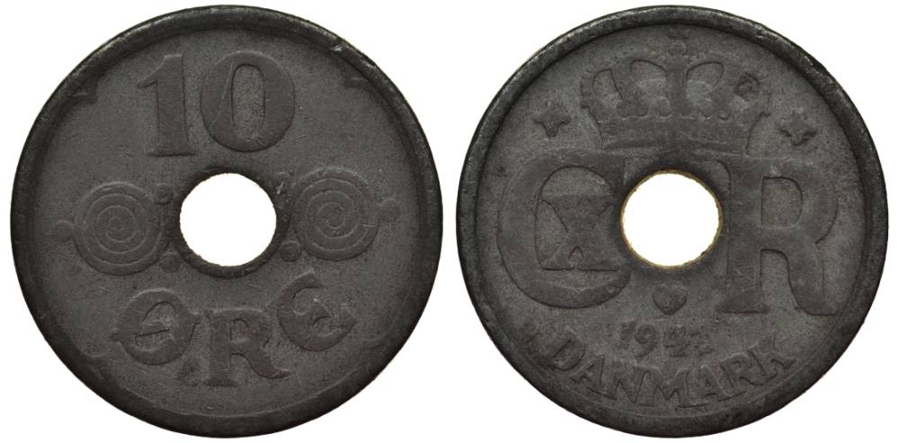 ДАНИЯ 10 ЭРЕ 1943 N; GJ, КРИСТИАН X (1912-1947) KM 822.2а цинк 4549-865