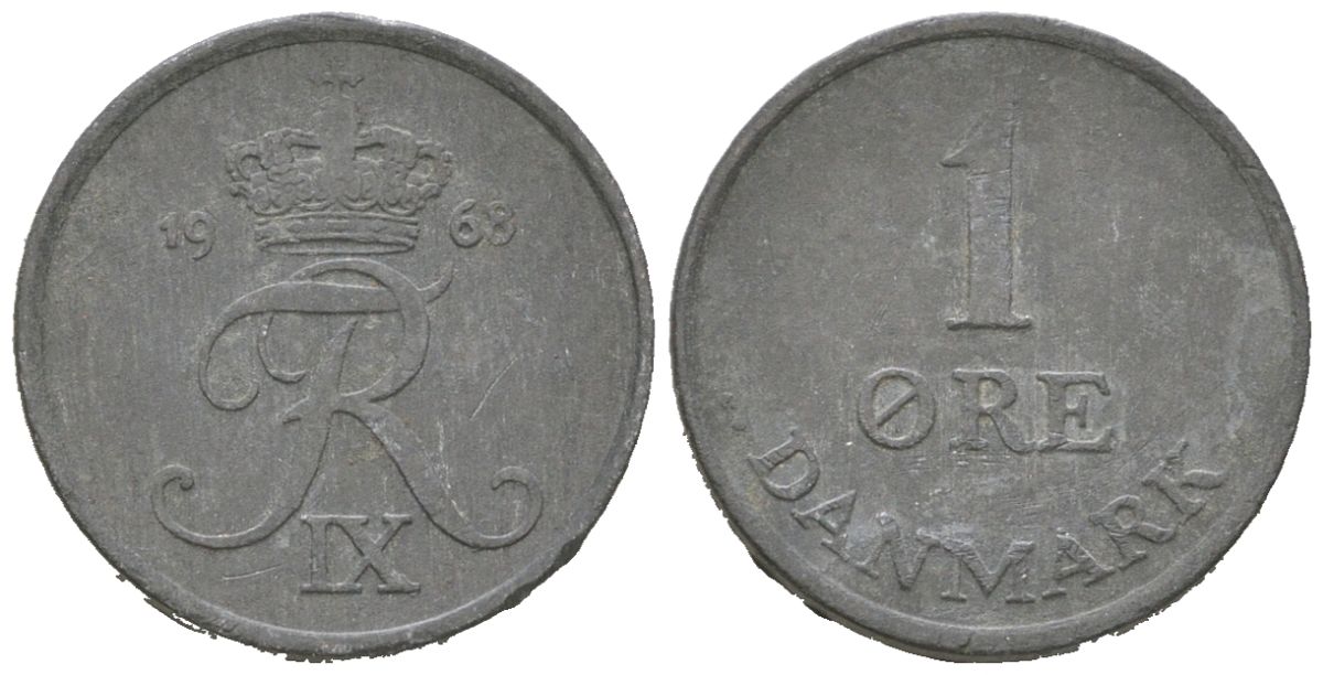 Дания 1 эре 1968 C; S, Фредерик IX (1947-1972) KM 839.2 цинк 3955-437