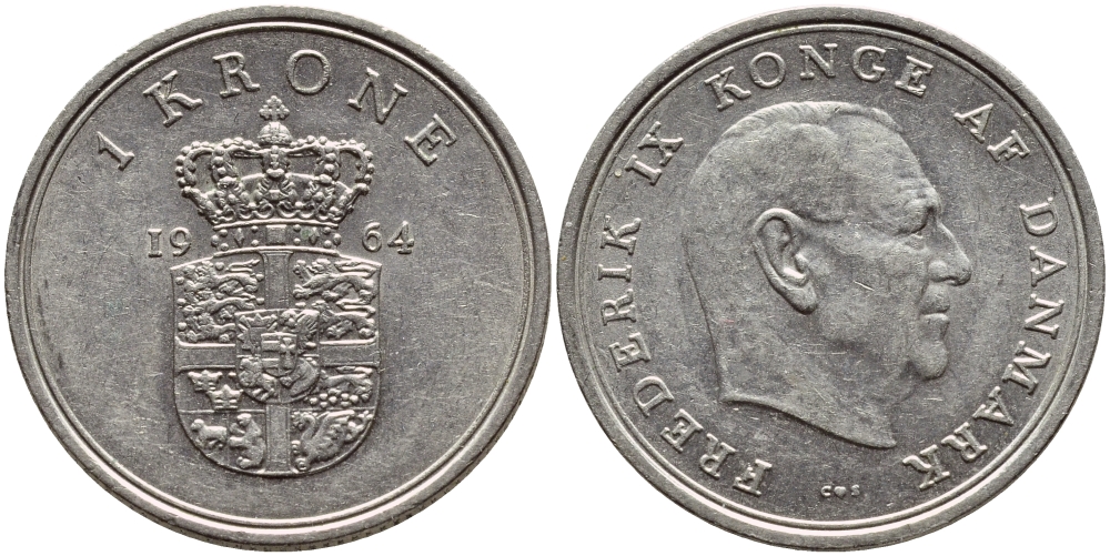ДАНИЯ 1 КРОНА 1964 C; S, ФРЕДЕРИК IX (1947-1972) KM 851.1 медно-никель 4398-1017