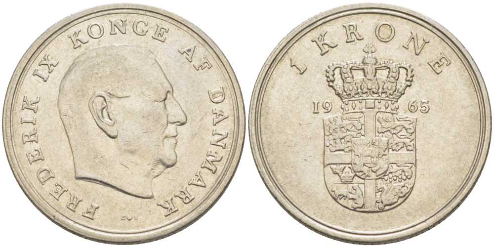 ДАНИЯ 1 КРОНА 1965 C; S, ФРЕДЕРИК IX (1947-1972) KM 851.1 медно-никель 95-224