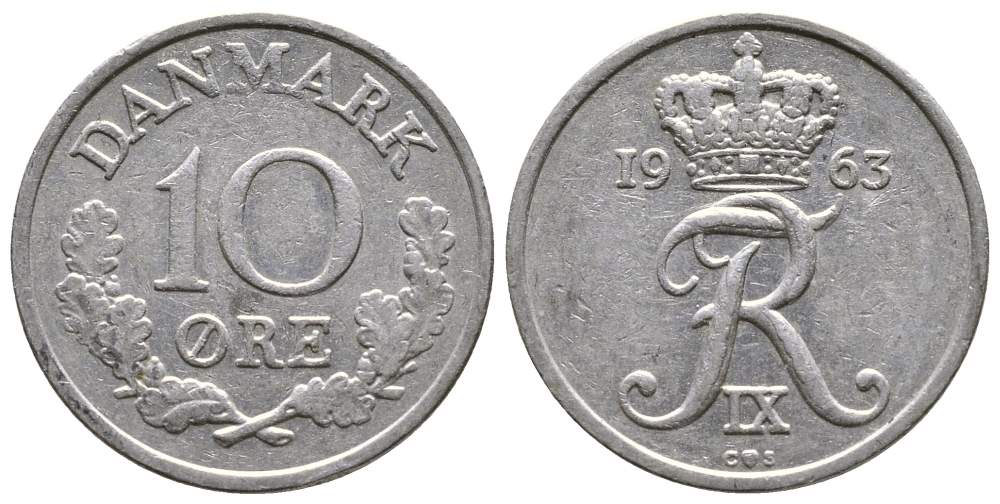 ДАНИЯ 10 ЭРЕ 1963 C; S, ФРЕДЕРИК IX (1947-1972) KM 849.1 медно-никель 26-868