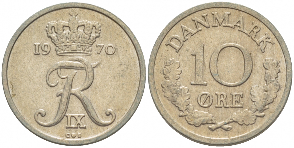 ДАНИЯ 10 ЭРЕ 1970 C; S, ФРЕДЕРИК IX (1947-1972) KM 849.1 медно-никель UNC 3718-345