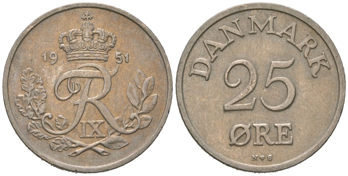 Дания 25 эре 1951 N; S, Фредерик IX (1947-1972) KM 842 медно-никель 4619-551
