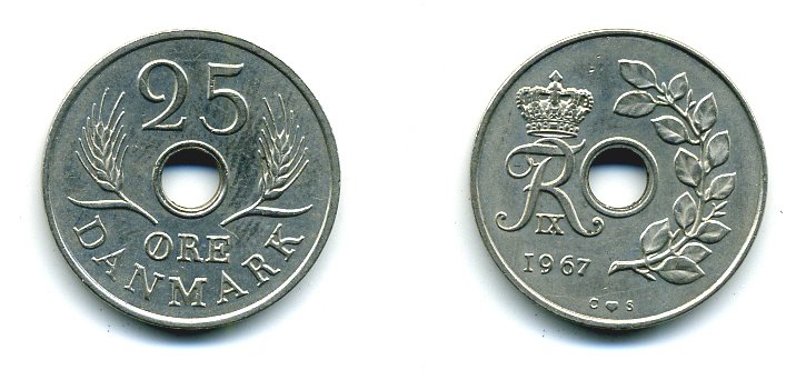 ДАНИЯ 25 ЭРЕ 1967 С; S, ФРЕДЕРИК IX (1947-1972) KM 855.1 медно-никель UNC 25-452