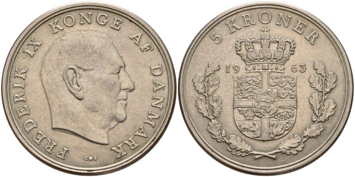 Дания 5 крон 1963 C;S, Фредерик IX (1947-1972) KM 853.1 медно-никель 4149-332