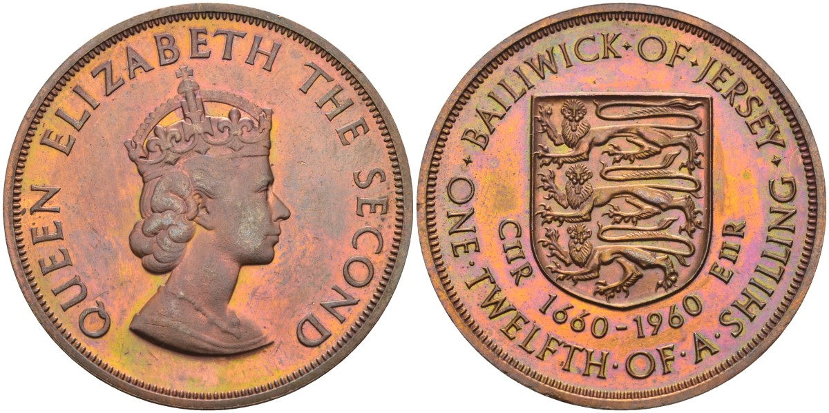 Джерси 1/12 шиллинга 1960 Елизавета II (1952-2022), 300 лет вступления на престол короля Карла II, тираж 4200 экз. KM 23 бронза PROOF 603-1122
