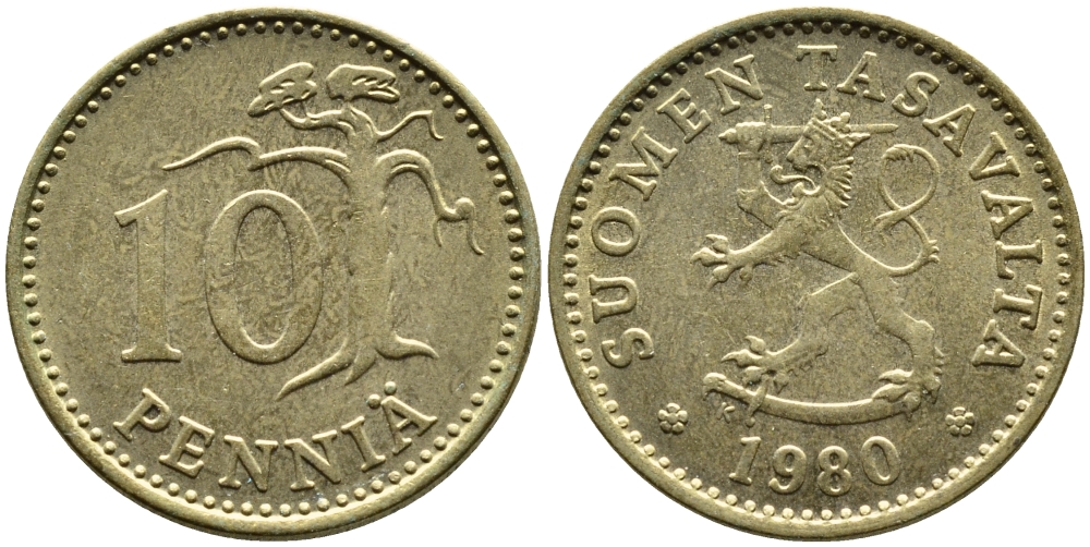 ФИНЛЯНДИЯ 10 ПЕННИ 1980 К KM 46 алюминиевая бронза 4391-1121