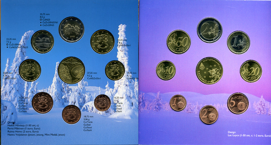 Финляндия евронабор из 8 монет + жетон 2003 золотодобытчики, официальный набор в оригинальном буклете биметалл UNC 7-5-6-04