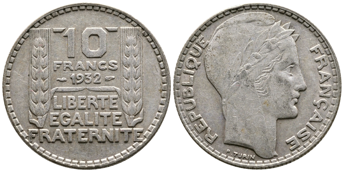Франция 10 франков 1932 Пьер Тюрен KM 878, Le Franc 360.5 серебро 79-1532